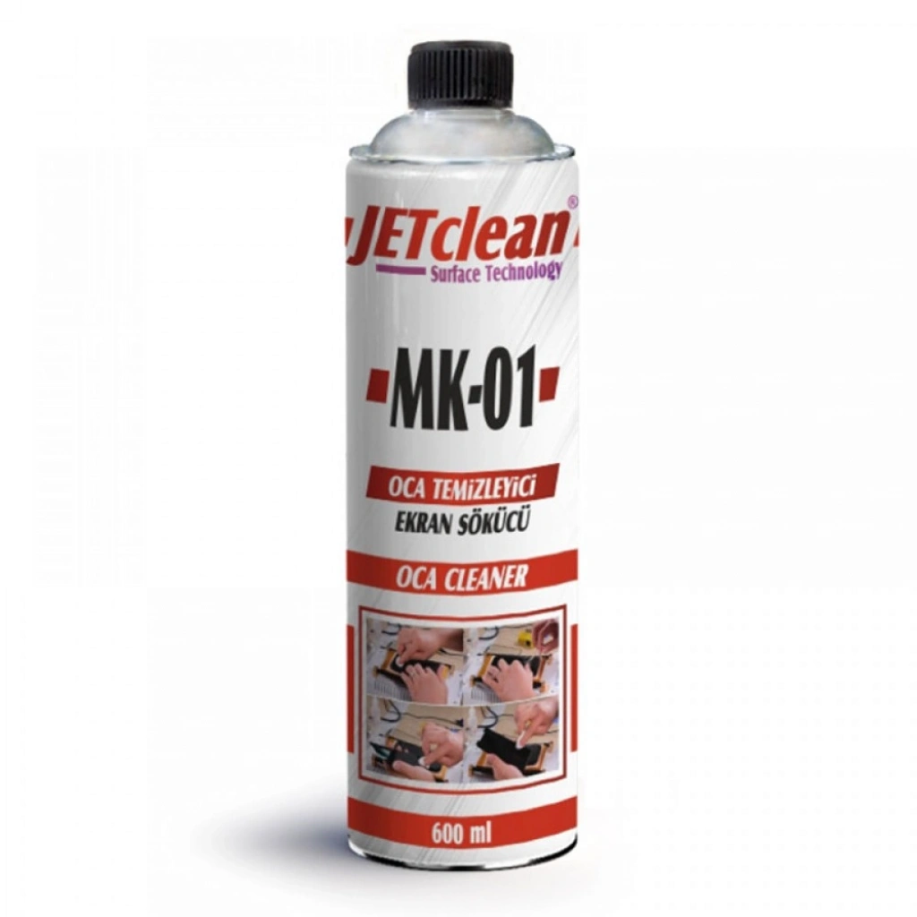 JETclean MK-01 OCA Temizleyici, ekran değişimi ve refurbish işlemlerinde OCA kalıntılarını hızlı ve güvenli şekilde temizlemek için geliştirilmiş profesyonel bir çözümdür. LCD ve cam yüzeylerde yapışkan artıklarını etkili şekilde çözer, yüzeyi yeni laminasyon işlemi için hazır hale getirir.